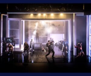 The musical is enhanced by the masterful production design, including video design from Christopher Anderson, which incorporates evocative clips and famous quotes. Simple, clean set design by Harry Gill, killer props (I mean that both figuratively and literally) and striking costuming by Jessamine Moffett enhance the offering.