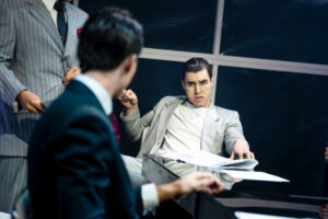 With a prestigious account up for grabs, he enjoys lauding it over his colleagues. They include Timothy Price (Jake Ameduri), Craig McDermott (Dan Ham) and David van Patten (Lauchlan Mant).