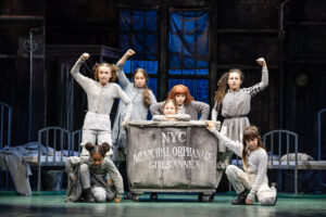 From the opening video montage to the close, I was mighty impressed by Annie’s staging. I speak of the projections by Craig Wilkinson and the scenery by Kenneth Foy. Evocative monotone sets represent the orphanage and destitute on the streets.