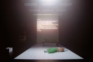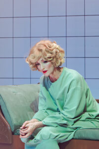 The set is straightforward; a retro TV & couch, a potted plant and what appears to be boxes full of files. Stark lighting bleeds into a ward-like stillness. Together, the props conjure a decade-specific domesticity— what unfolds are themes of ‘60s repression colliding with ’80s denial, where hysteria was finally scrubbed from the medical dictionary.