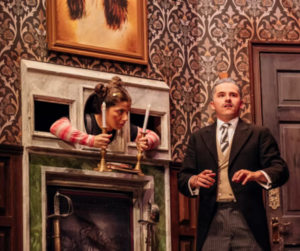 But there are also the one-liners, including those from the faux director of The Murder at Haversham Manor in introducing the show. And, again, when he returns, engaging the audience ahead of Act II.